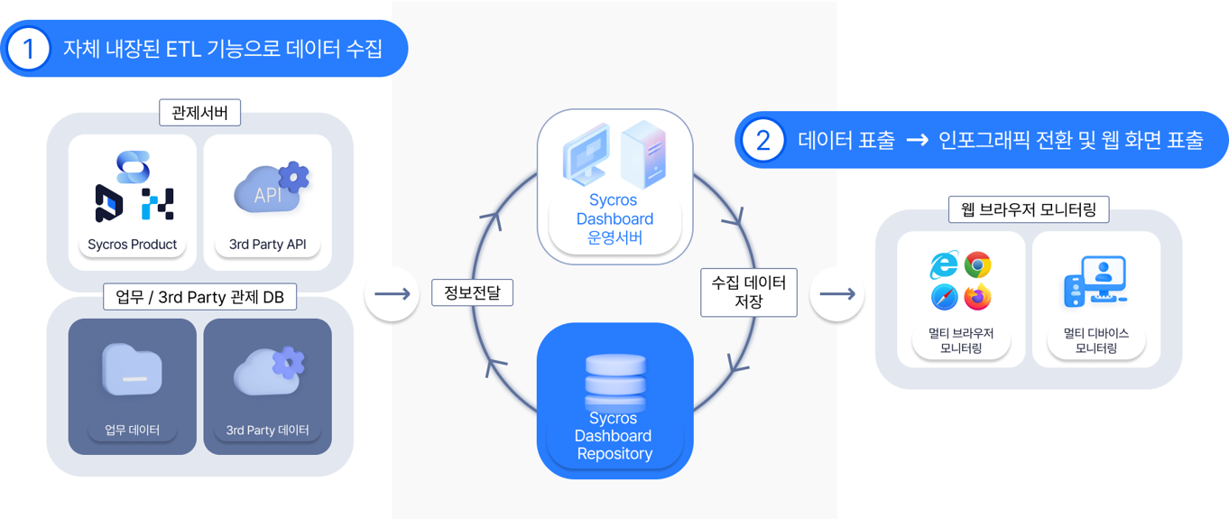 Kt cloud 마켓플레이스에 입점되어 있는 Sycros Dashboard는 직관적이고 시각적인 인포그래픽스 화면을 사용자의 편의에 최적화된 화면으로 IT인프라 운영 현황 및 서비스 상태를 한눈에 볼 수 있는 통합 모니터링 환경을 제공합니다. 또한 편집기가 내장되어 있어 사용자가 원하는 글자, 색상, 모양, 이미지 등을 변경할 수 있으며 편집한 내용이 그대로 대시보드에 반영됩니다.