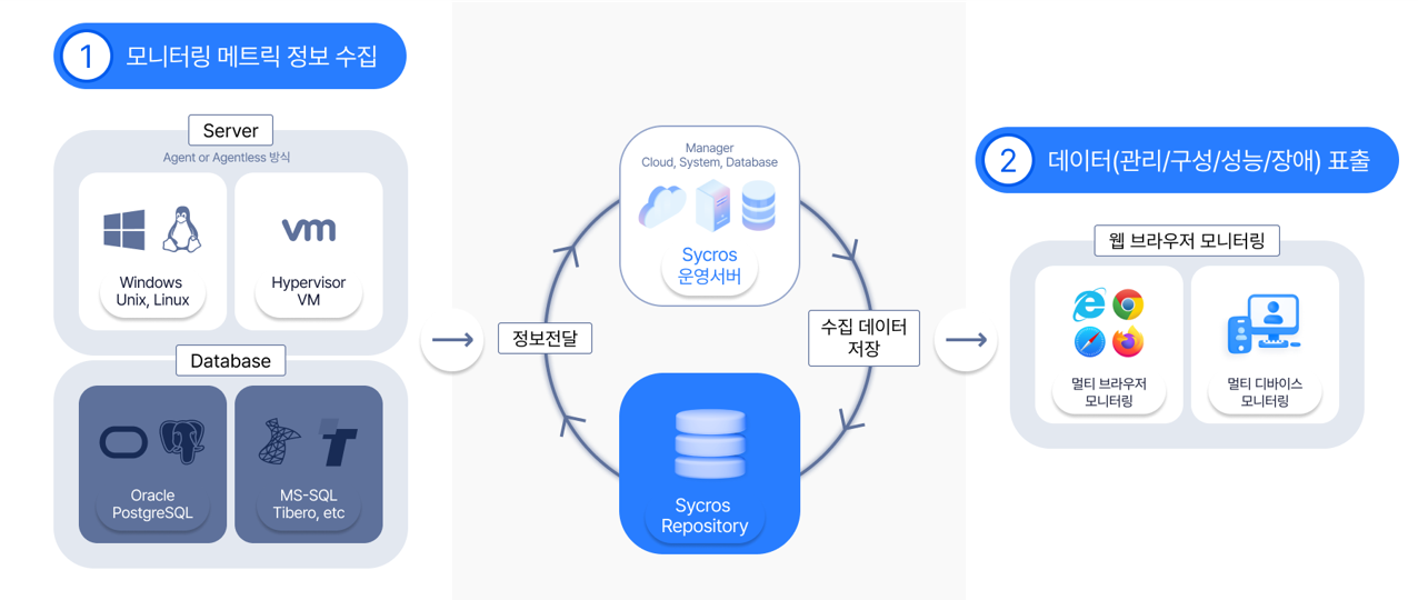 시스템 관리 솔루션인 Sycros System Suite(SMS)는 Cloud 환경의 가상서버, 가상머신 및 이기종 서버와 데이터베이스를 실시간 성능/운영/장애등 통합관리를 위한 모니터링 제품으로써 최적의 운영관리를 위해 다양한 모니터링 메트릭을 제공하고 실시간 모니터링과 보고서를 통해 효율적인 운영환경을 제공합니다.
