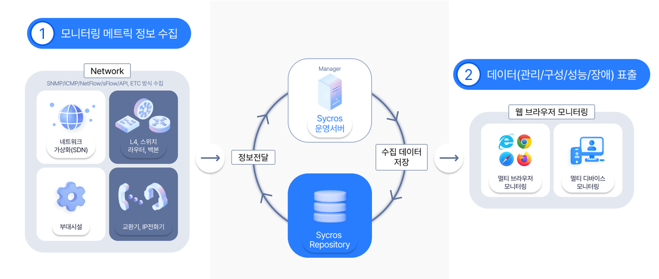 네트워크 관리 솔루션인 Sycros Network Suite(NMS)는 복잡한 이기종 네트워크를 안정적이고 효율적으로 운영하기 위하여 구성, 성능, 장애 정보의 통합 관리를 위한 모니터링 솔루션 입니다. 일반적인 네트워크는 물론이고 Cloud 환경에서의 네트워크 가상화 환경에서도 최적의 성능으로 운영 관리환경을 제공합니다.